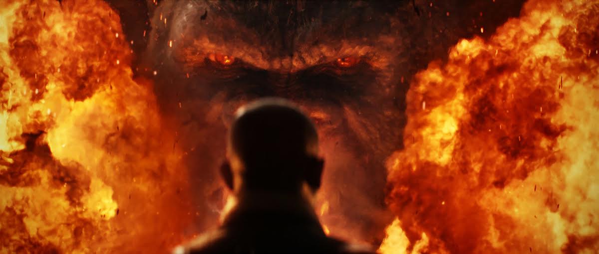 Earlier in the movie, after the helicopters all crashed, there is a stunning shot of Conrad and Kong staring each other down. It is pure cinematic magic where the anger in Conrad's eyes match Kong's fierce expression. Between the man and the monster, there is no love lost. That brief scene sets up a bitter rivalry with no possibility of a peaceful resolution. As a viewer, you know from that moment on that one will kill the other.
